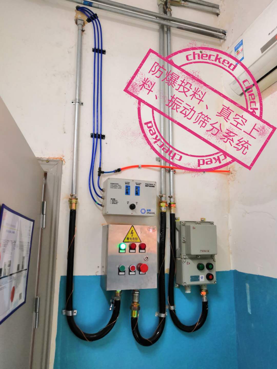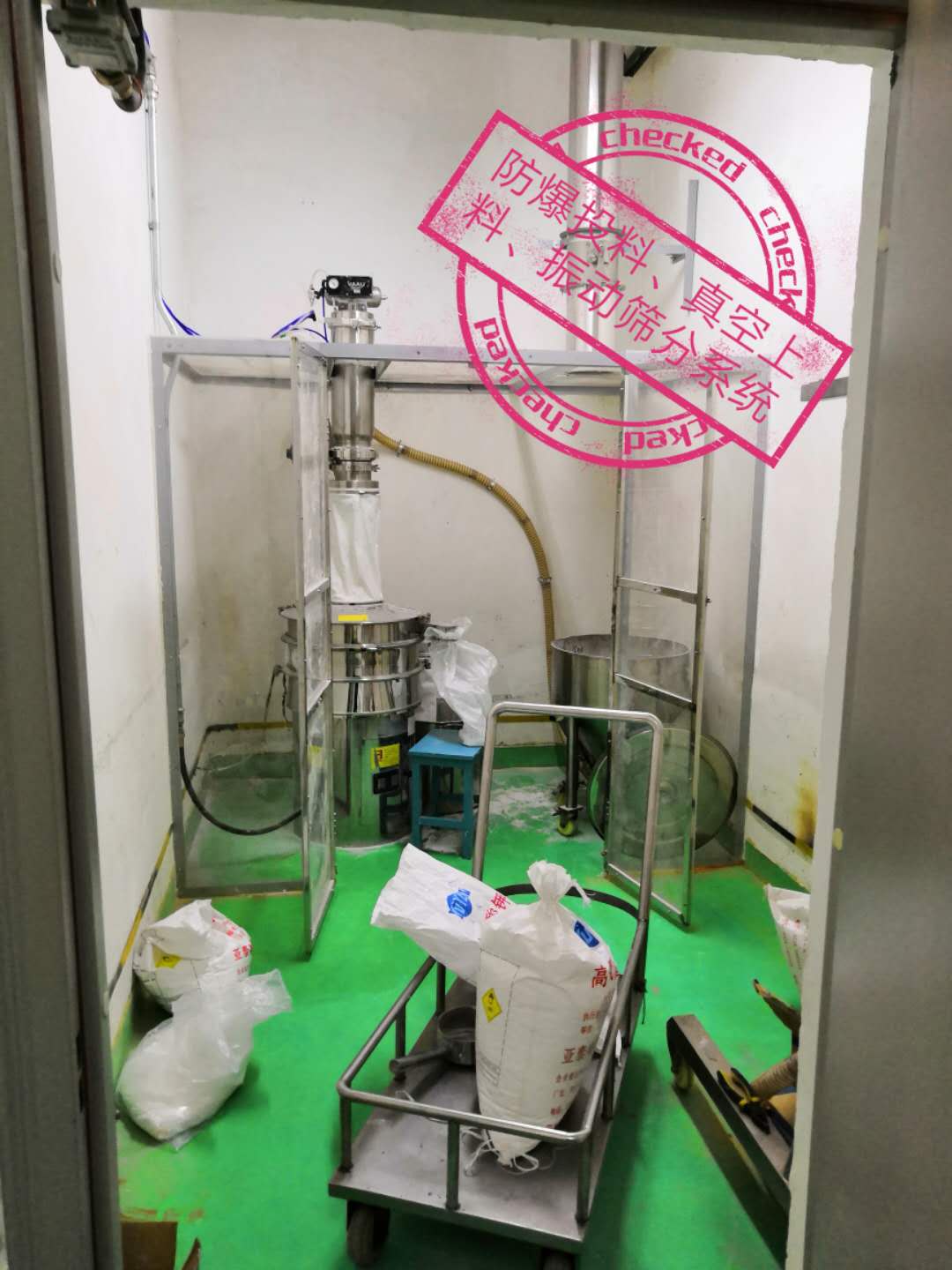 下圖是我司給西安某汽車安全氣囊引爆裝置生產(chǎn)線提供的上料機設備,此設備是用來給篩分機上料的,物料為高氯酸鉀,為易爆品,需要符合防爆要求,我司的真空上料機采用全氣動系統(tǒng),動力及控制全部是氣動實現(xiàn),從根源上就符合了防爆要求,而且性能穩(wěn)定,安全可靠。
