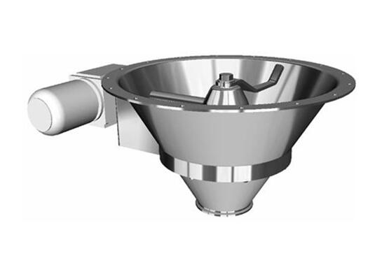 攪拌料斗的主要目的是為了將壓實的物料通過低速攪拌變成松散狀態,以方便下一步的輸送和包裝。工作時通過電動機帶動垂直設置在攪拌倉內的攪拌軸旋轉,軸上安裝攪拌漿葉,轉軸帶動漿葉對倉內物抖進行剪切、擠壓和翻轉推移的強制攪拌作用。使物料在相對運動中得到攪拌和疏松。